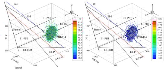 (a) The dip of micro-fractures within the surrounding zone of PDT-114. (b) the strike of micro-fractures within the surrounding zone of PDT-114.