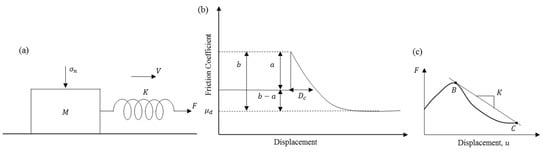 where and are the experimentally measured parameters of rate-state friction law (Figure 5b). is the mass per unit area . is the normal stress and is the slip rate; is a distance for the evolution to steady state. Equation (13) can be found in [,]. In practice, represents elastic properties of the rock surrounding the fracture/fault and the size of the latter. Equation (14) describes the penny shape fracture shear stiffness []; is the fracture radius and is the shear modulus.