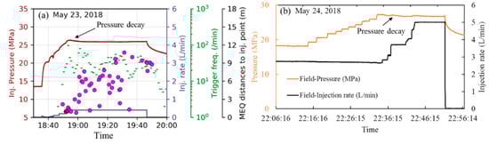 Injection profiles and induced seismicity for Stim-II HF ≅ 164 Notch []. (a) The injection profiles of the test on 23 May 2018. The green dots represent the micro-seismic events per minutes. The pink dots represent the distance between events and the Notch ≅ 164. (b) The injection profiles (SNL14) of the test on 24 May 2018.