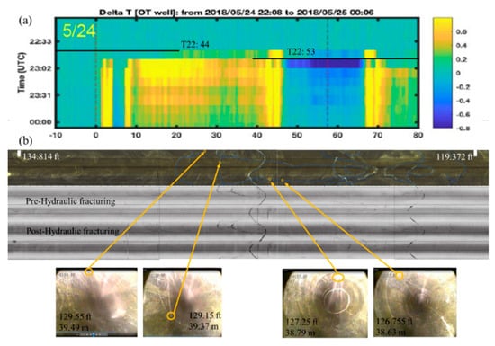 Observations at E1-OT and E1-P caused by injection []. (a) The temperature perturbations along E1-OT on May 24. (b) The water jet occurs in E1-P at 126 ft and 129 ft depth. The water jetting was detected on May 25.