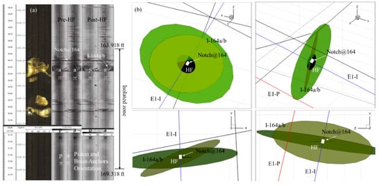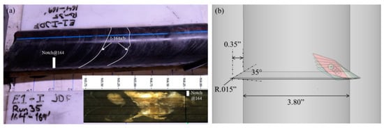 The details of core and notch at 164 ft depth along E1-I []. (a) Core and acoustic televiewer log showing the fractures in E1-I (at 164 ft to 169 ft depth) []. (b) sketch of the geometry of Notch ≅ 164 along E1-I [].