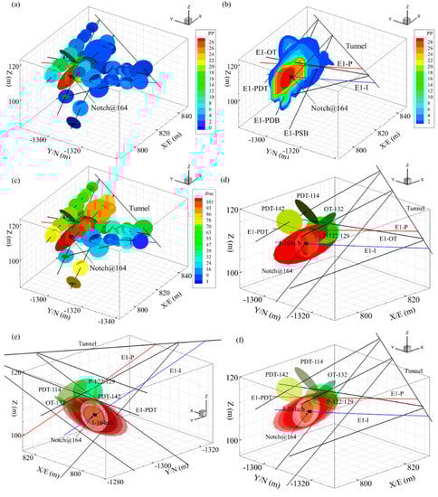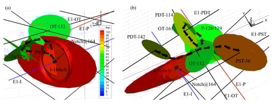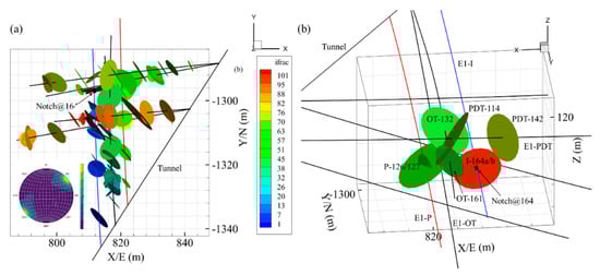 The configuration of major fractures and their orientation []. (a) There are 101 major fractures in this configuration. Most fractures are steeply dipping. (b) Some major fractures surround the Notch ≅ 164. An OT-PDT-P connection can be extracted from Figure 15b: E1-OT→OT-161→PDT-114→E1-PDT→P-122/126 →E1-P or E1-OT→OT-161→P-126/127 →E1-P. Such a connection partly matches the field observation during the fracture mapping exercise [].