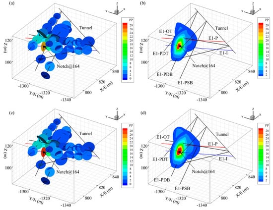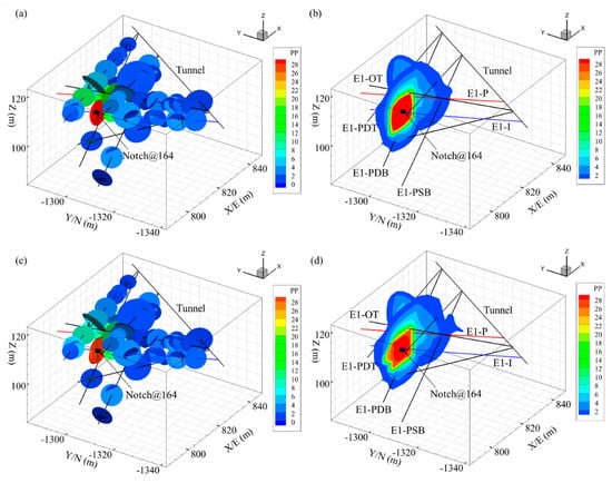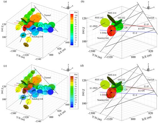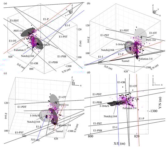 Distribution of seismicity and location of four major foliation planes estimated from field observation (e.g., seismicity and ERT). Black spheres represent the field-observed seismicity. Pink cubes represent the simulated seismicity. Foliation planes 3 and 4, I-164-a/b and PDT-114 have slipped. The simulated seismicity generally matches the field-observed seismicity. Different figures (a–d) show different views.