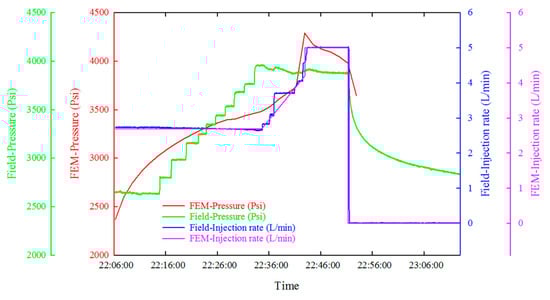The injection profile of the Stim-II HF ≅ 164 Notch is shown in Figure 6a []. As can be seen, the pressure drop is approximately 1 MPa and is indicative of a small hydraulic fracture and/or dilation of natural fractures. Because two natural fractures and Notch ≅ 164 practically are located at the same place in the hole the injected fluid can easily enter the two natural fractures []. The injection profile of the test on May 24 shows that the injection rate is relatively high (maximum flow rate is 5 and duration was 31.7 min) in comparison with the injection rate on May 23 (maximum flow rate of 0.4 and duration was 65.2 min). In addition, our simulations how that the pressure drop for fracture initiation form a notch would be larger than 10 MPa. Therefore, it can be suggested that the flow pathway from the injection well was formed by opening and extension of a natural fracture rather than by initiation of a new hydraulic fracture from the notch.