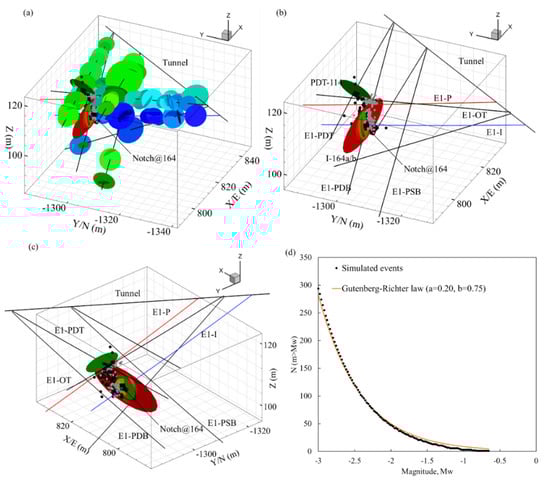 If is equal to one, Equation (23) attempts to calculate the seismic energy of fictitious events. Equation (23) can theoretically be used to generate an infinite number of events and some constrains are needed to limit the number of events. The first prescribed condition is the energy conservation, i.e., the total seismic energy of the real event cloud should be less than the seismic energy of the fictitious event. While the seismic energy of the fictitious event is defined according to Equation (19). In practicality, Equation (19) can describe the seismic moment from all the slip events (on/off a fracture). Thus, Equation (19) in numerical model is supposed to already consider seismic moment from all the slip events (on/off a fracture):
