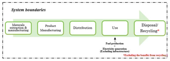 The following stages were considered: materials extraction and manufacturing, product manufacturing, distribution, use and disposal/recycling as described in Figure 2.