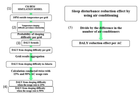 As mentioned earlier, the benefit in this paper is defined as health effects’ reduction by introducing air conditioners. Both housing and apartments were considered in the calculation. The health effect considered was sleeping difficulty, as one of the main health effects directly associated with heat. For heatstroke, there is no damage function linking health effects to air conditioning usage rate; it is difficult, at present, to quantify the heat reduction effects and, therefore, the DALY reduction by air conditioning introduction [25]. An indicator expressed in DALY is very useful to consider both mortality and morbidity; it represents the sum of the years of life lost (YLL) due to a disease (early death) plus the number of years lived with a disability (YLD). The DALY calculation procedure for sleeping difficulty is described in Figure 4 and below: