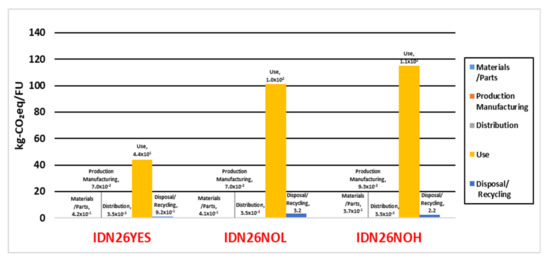 The integration introduced in the LIME3 method allows the estimation of the monetary valuation of the environmental impacts in USD on the global scale. Again, the total impact is mainly influenced by the use stage and electricity generation, as shown in Figure 10. Considering the contribution of each impact category (Figure 11), we found that climate impacts are mainly produced by the electricity generation. As a result, the models without inverters have a more than two-fold higher climate change impact. The impact on air pollution is greater than on climate change. Research concerning cooling, in general, have only focused on climate change. As such, it is important to compare both impacts, especially when evaluating electronic appliances in developing countries or newly industrialized countries, as these countries often rely on fossil fuels to produce electricity. The emissions of PM2.5 per kWh produced in Indonesia is high (2.53 × 10−2 kg/kWh) due to the use of lignite. Because Indonesia has limited oil resources and imports most of its oil from countries where the oil depletion is high, its integration factor is one of the highest globally in the LIME3 assessment method. As lignite is missing in the LIME3 method, we did not evaluate the depletion of this resource.