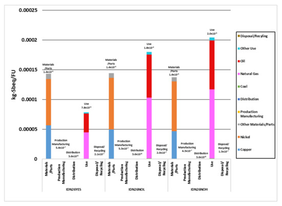 For the resource consumption, compared to previous studies [10,13], we observed a high contribution at midpoint by nickel due to the relatively high amount required to produce 1 kg of copper and 1 kg of iron per the Ecoinvent database. As a comparison, a trial calculation was performed for the IDN26YES model using the Japanese LCI inventory database (IDEAv2 [37]): the impact of copper was estimated at the same level; however, the impact from nickel was estimated to be about five times lower. The impact at midpoint of iron is relative low due to the limited importance assigned to this resource by the LIME2 method. From the inventory provided by the air conditioning manufacturer, we could not confirm whether rare metals were involved in the production of the AC units. Recently, the criticality of rare metals has been a focus [38]; this could be a future topic of research.