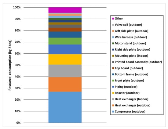 If focusing on the resources consumed by AC parts, as shown in the example in Figure 9, more than 50% of the resource consumption is due to the compressor and the heat exchangers, which are mainly composed of iron and copper. The remaining consumption is partly due to the indoor and outdoor unit bodies as well as piping. No significative difference was observed between the models with and without inverters.