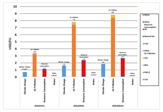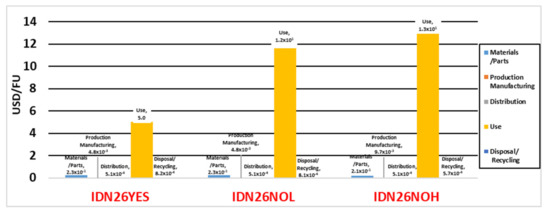 To obtain the cost, the previous section’s results were utilized to obtain the impact of one unit during a full-life cycle (10 years). The total integration results (cost) were found to range from USD 2003–5088. The results for climate change were found to range from USD 273–709. The results for air pollution ranged from USD 1292–3343, and the results for resource consumption ranged from USD 432–1019. The results for water ranged from USD 7–17.