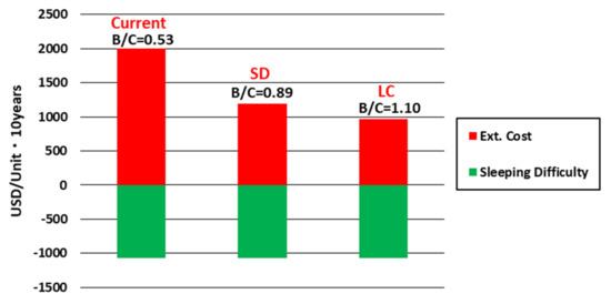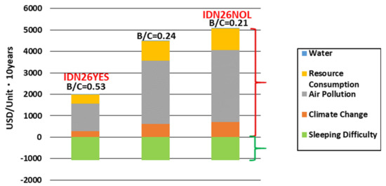As explained in Section 2.4.2, a cost–benefit analysis was conducted in Indonesia based on the previous results. This a novelty compared with previous studies. For this calculation, a 10-year life cycle per unit was considered. The reduction in the burden due to sleeping difficulties for 10 years per unit was estimated at 0.046 DALY (based on the procedure detailed in Figure 4). The health effect reduction, expressed in DALY, was converted into USD using the economic value conversion included in the LIME3 method: 1 DALY = USD 23,000.