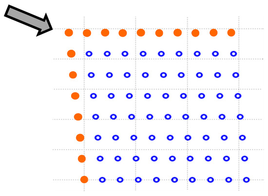 Sketch of a wind farm (Horns Rev 1) with wind vector from northwest, where the wind turbines along the first northern and the first western line (red dots) are seen to be directly exposed to the free wind.