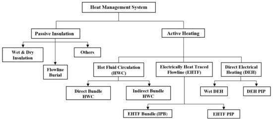 Heat management systems is a practice of maintaining the fluid temperature inside the flowline well above the Hydrates Formation Temperature and WAT [49,50]. The heat management system is regarded as very valuable in flow assurance solutions due to its cost-effectiveness [50]. As the oil and gas fields progress into deep water [51], there is an increasing demand for a heat management system to stop the formation of hydrates and wax in the subsea systems [51]. Therefore, a good heat management plan is selected based on the needed cooldown time, water depth, U-value, and temperature range [51]. The heat management systems consist of active heating and passive insulation. The active heating system uses external heat sources like hot water, direct electrical, and electrically heat-traced flowline to warm the produced fluid [49] while the passive insulation system utilizes material like Mineral wool and Polyurethane with a low thermal conductivity to lower heat loss to the environment [49]. A heat management system flowchart is seen in Figure 2 below.
