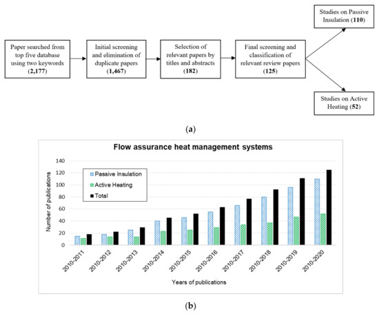 The study on heat management systems was done to evaluate and validate the popularity of the subject by researchers, data were collected in the last ten years (2010–2020) from the databases of the top five publishers (Elsevier, Springer, Taylor & Francis, Wiley, Sage) of the largest toll-access publishers [59,66] using two keywords (Heat AND Flowline, Thermal AND Flowline). The top five publishers in the largest toll-access publishers were assessed based on their number of publications. After data collection using keywords, screening, and elimination of duplicates were done to determine the relevant articles, and subsequently, one hundred and twenty-five (125) relevant articles were finally screened, selected, and classified into passive insulation and active heating as seen in the workflow of Figure 3a. A comparison of the heat management systems from Figure 3b below shows that approximately 42% (52 articles) of the total work done by researchers was in active heating while 88% (110 articles) in passive insulation. This number is low for active heating when compared with passive insulation. Thus, the need for more technical efforts and scientific research in the area of active heating as the quest for hydrocarbon move into deeper water.