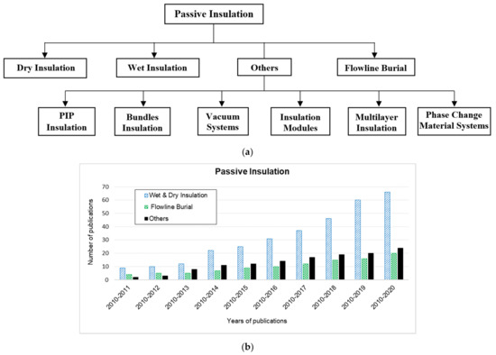 Passive insulation in the operation and design of subsea flowlines is very important because of the unfavorable low temperature and high-pressure conditions; such an environment creates stringent needs for optimal insulation [68,69,70,71]. The passive insulation system of heat management is flowline insulation with materials of low thermal conductivity like polypropylene, polyethylene, polyurethane, extruded polystyrene, fiberglass, mineral wool, rubber, glass-reinforced plastic, Vacuum Insulation Panels (VIPs), and aerogel [50,72,73,74], to control and reduce the loss of heat from the crude oil to the surrounding [50,75,76]. Some insulation types are dry and wet insulations, flowline burial, Pipe-In-Pipe (PIP), and others [50,77,78] (Figure 4a). With separated flowline operating conditions, aside from installation approaches and cost, the option of insulation materials is reliant on the material properties like density, mechanical strength, thermal conductivity, water absorption, flexibility, aging, and corrosion resistance [65,79,80,81,82]. The usual thermal insulation is mostly manufactured in few format types like composite syntactic, brown foam, and syntactic [81,83,84,85,86].