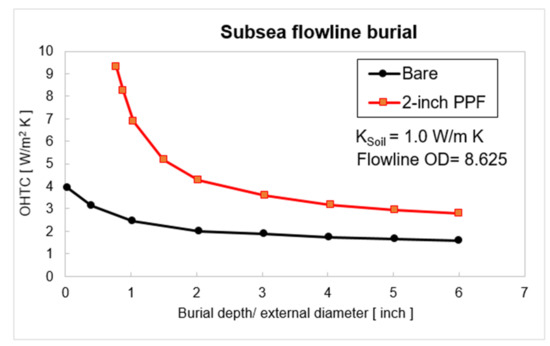 Flowline burial has the edge of utilizing the soil good heat capacity that acts as both heat storage and sinks [50]. Therefore, a buried insulated flowline has a greater heat capacity than a PIP system with extended cooldown time [49] while the installation cost of a buried insulated flowline is roughly 35–50% higher than that of a PIP technique [49,101,102]. In the course of the shutdown time before the advent of hydrates nucleation or gelling of wax, a buried flowline has four times higher retention capacity for heat than a PIP system [50,103,104]. This can be an important reduction in the overall project for long flowline systems [49]. Some other merits of flowlines burial system include more option on installation vessels and contractors, more options on the vendor for the fabrication of flowline, when compared to PIP system gives a slower cooldown time during shutdown and a likelihood of single flowline repair [49], and also provide a reduced time and enhanced schedule for first oil [49,105,106]. Oh et al. [107] carried out laboratory experiments to ratify some numerical and analytical models [50,108,109,110,111]. Figure 6 shows the comparison between burial depth and U-value for both bared and a coated polypropylene foam flowline [51]. It is also important that challenges like upheaval buckling and seafloor buckling are examined during the design of a good scouring depth for flowline burial [51,112,113].