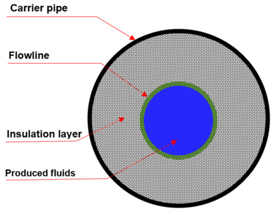 PIP insulation is a single-insulated inner flowline centrally located inside an outer protective pipe [49], between the protective outer pipe and inner pipe, there is an annular space for insulation to prevent heat losses from the flowing fluid [115]. Different insulation materials like aerogel, mineral wool, vacuum or inert gas, and Polyurethane Foam (PUF), etc. occupy the annulus connecting the pipes [82], as seen in Figure 7. The PIP insulation is an upgrade of the dry insulation to stop the ingress of water into the insulation layer for superior performance [49,50,116,117].