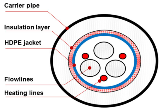 Bundles are mainly applied for combined flowlines installation inside a carrier pipe or outer jacket [51]. The bundle systems are akin to the PIP systems other than that bundles contain several pipes [85,122,123,124]. Figure 8 shows the flowline bundle configuration. Bundle systems give appealing solutions to a broad scope of the issues of flow assurance by presenting a cost-effective technique and also the likelihood of circulating a medium for heating [51]. The additional benefits are as follows: it allows for multiple flowlines installation into a single pipe design [51]; the outer pipe is utilized to withstand subsea hydrostatic pressure in deepwater [51]; finally, bundles permit the introduction of monitoring devices and heated pipes [72]. The bundles’ drawbacks are its length limit (shallow water installations) and the demand for a comfortable launch and fabrication location [72].