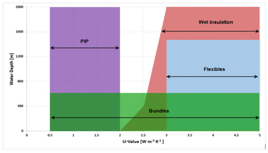 Figure 9 shows the application of passive insulation systems for PIP, wet, flexible, and bundles. The towed bundles are constructed in water depth below 500 m [72] whereas the PIP and wet insulation can be used for water depths of up to 2000 m [72]; the U-value of the PIP flowline is relevant to most required U-values [72]. Table 4 compares the different passive insulation systems.