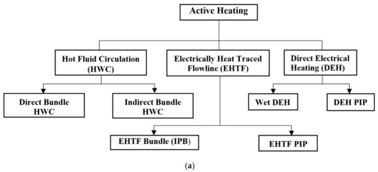 In this situation, active heating looks good enough as a cost-effective alternative for both subsea in-field and long tie-back developments [160]. From a technical viewpoint, the use of active heating permits transient and steady-state operations simplification of highly complex fluids by managing wax, hydrates, high viscosity and pour point issues with continuous or discontinuous heating [160]. The conservation and line start over by active heating method permit the change to a single line framework that presents significant cost gains through a reduction in the number of flowlines from a conventional circuit system with chemical injection and dead oil circulation [160,163,164,165]. The active heating system involves the external addition of heat to the production flowline by an electrical heat source or circulated hot water [166,167]. The active heating technique is an attractive, economical, and effective solution for flowline heat management systems particularly in subsea deepwater fields where flowline pressure and temperature conditions are unfavorable [49,50]. For most fields, the goal is to stay above the region of 15 to 40 °C [161]. Therefore, the active heating method is used for many situations in flowlines [49,76], such as the prevention of cooldown and warming up of non-flowing systems like (e.g., during shutdown or startup) [49,168], sustaining and increasing temperature while flowing [49]; decreasing the need for chemical injection [49,76]