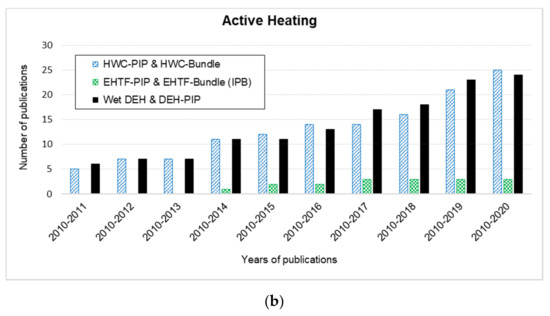 Compared to passive insulation, active heating can sustain the hydrocarbon fluid temperature beyond the hydrates and wax formations temperatures over long periods [49,76]. Three heating systems exist; Hot Water Circulation (HWC), Electrically Heat-Traced Flowline (EHTF), and Direct Electrical Heating (DEH) as shown in Figure 10a. A study on active heating systems in the last decade compared the different heating systems as shown in Figure 10b. There is 48% (25 articles) research work on Hot Water Circulation (HWC)-PIP and Bundle, 46% (24 articles) for Direct Electrical Heating (DEH)-Wet DEH and DEH PIP and 6% (three articles) for Electrically Heat-Traced Flowline (EHTF)-EHTF Bundle (IPB) and EHTF PIP.