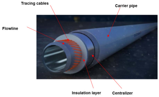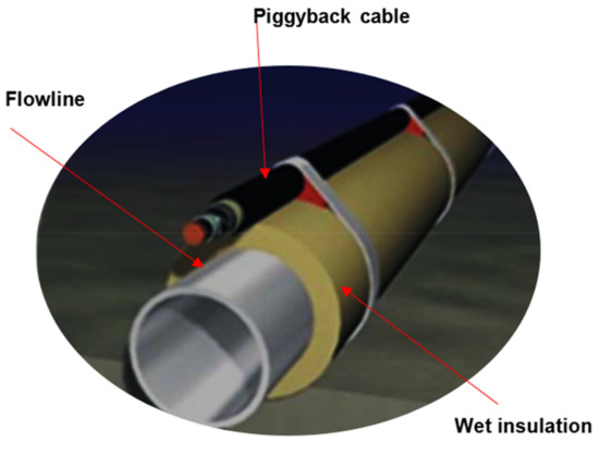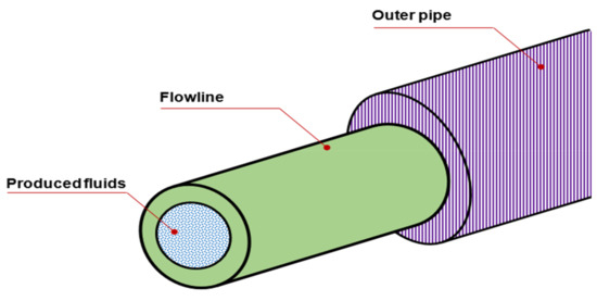 A hot water bundle is a carrier pipe within which any combination of individual flowlines and umbilical components are carried and there is hot water distribution in close vicinity to the production flowline in an assigned line [160]. Bundles with dry insulation having U-values of 0.5 W/m2 K are highly efficient insulation systems [161]. Two types of Bundle HWC used in shallow waters are direct heating by annulus circulation and indirect heating circulation through dedicated hot water lines (Figure 12a,b).