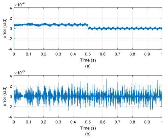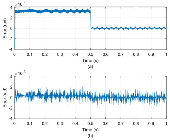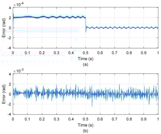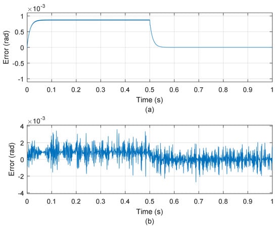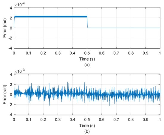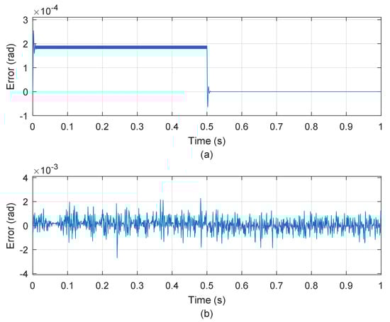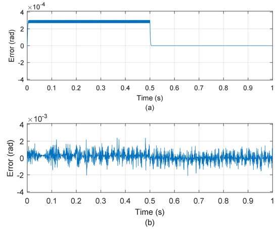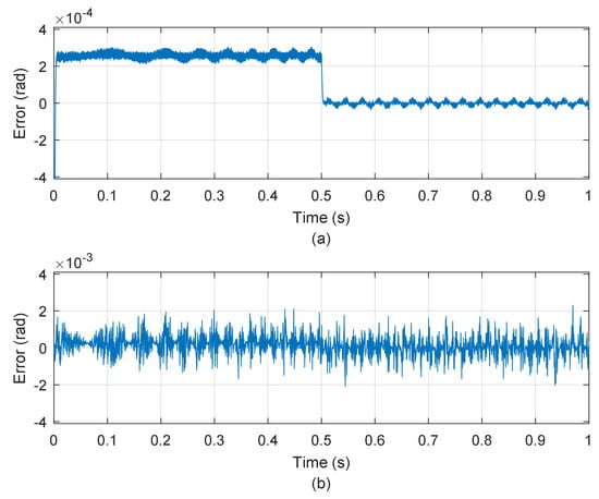 Figure 15, Figure 16, Figure 17 and Figure 18 show the results for the HIL tests. In the tests without noise, it is possible to see a ripple in the angular position error during constant speed operation (from 0 s to 1 s). This ripple is produced by the limited number of bits used for the arithmetic operations. However, that ripple is negligible (that ripple has an amplitude less than rad).