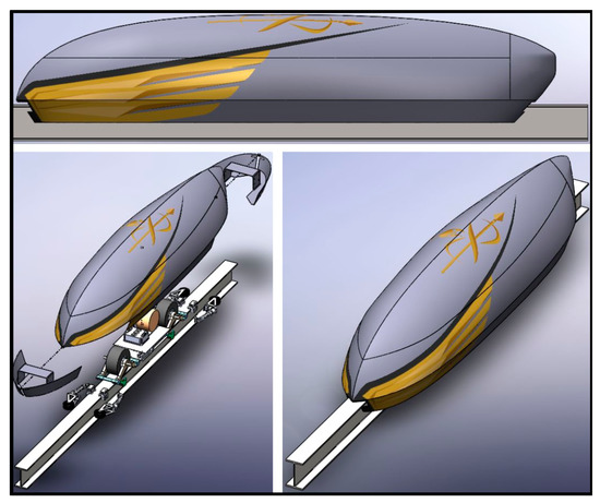 The study described in this paper is conducted on the aeroshell modeled by the Spartan Hyperloop student team from San Jose State University (SJSU), a team that regularly participated in SpaceX’s Hyperloop pod competition. The team has developed a design for the aeroshell using CFD techniques and this shell has a reasonably low coefficient of drag in an open environment. This aeroshell has a three-piece modular design for ease of assembly and uses a slide-on latching and fastening mechanism to attach to the chassis of the pod. The design of the aeroshell is inspired by Maglev trains and Tesla’s Model 3. Figure 2 depicts the CAD model of the design used for the study. The study is performed on the full-scale passenger-size pod with overall dimensions of 30.5 m × 4.6 m × 3.8 m (100 ft. × 15 ft. × 12.5 ft.), as shown in Figure 3.