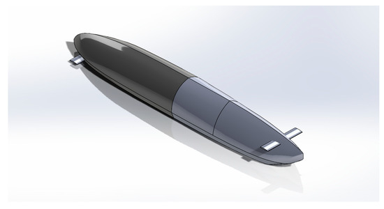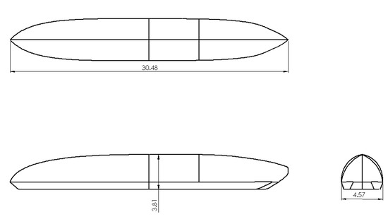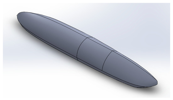 The model has been made using SolidWorks 2019. For the numerical simulations, ANSYS 19.3 FLUENT (Version 19.3, ANSYS, Canonsburg, PA, USA) has been used. The model for this phase has an overall dimension of 30.5 m length, 4.6 m width, and 3.8 m height. The front of the body resembles a quarter Sears–Haack body [47] (Figure 4), which is defined as a body with the theoretically lowest wave drag in supersonic flow and is modeled by the Prandtl–Glauert equation [48]. The cross-sectional area and the volume of a Sears–Haack body with radius R and length L are given by: