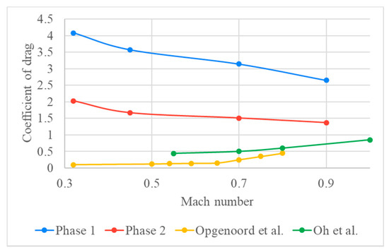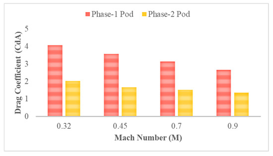 Figure 8 shows the drag coefficients obtained by two similar studies in the literature [9,41] and a comparison of the phase 1 and phase 2 values with those. Please note that a direct comparison of these values is not possible, as all the three studies use different pod profiles, dimensions, and tunnel dimensions. The coefficient of drag in phase 1 and phase 2 pods are significantly higher than those of the other studies due to the constrained space around these pods. In the studies by Opgenoord & Caplan [9] and Oh et al. [41], significantly relaxed constraints are used (more space is available between the pod and the wall of the tunnel) and the pods are significantly smaller in length. In ref. [9], a pod of 2.4 m length with a tunnel pressure of 860 Pa is used. In ref. [41], pods of various lengths are used with their minimum length being 10.75 m. They also showed an increase in the coefficient of drag as the pod length increases, which agrees with these results. Phase 1 and phase 2 pods do show a slight reduction in the coefficient of drag as the Mach number increases—this is primarily due to the design of the aerodynamic profile for the pod. The design for the profile is primarily inspired by the Koenigsegg Regera. Koenigsegg is known to build supercars with a continuous goal of setting and beating records with their precision engineering.