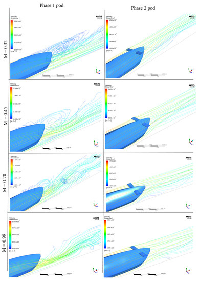 Next, the velocity stream lines around the pods were studied to understand the formation of eddy currents. Figure 10 shows the stream lines for various Mach numbers. Four different speeds for the pod in the vacuum tube were considered: 112, 154, 241, and 309 m/s. The corresponding Mach numbers for the pod were 0.32, 0.45, 0.70, and 0.9. At M = 0.32, air flow was observed to be unhindered for both models, but Phase-1 had more eddies forming in comparison to Phase-2. Phase-1 was observed to form eddies even before reaching the Kantrowitz limit. After reaching the Kantrowitz limit (at M = 0.45), the air flow got restricted at the top of the pod and the points were formed where the air can pass at very high speeds, primarily due to the very low clearance between the top of the pod and the tunnel’s roof. Other aerodynamic studies on Hyperloop pods [9,41] also showed a very similar behavior of air flow during their analysis. In both these studies, a significant pressure increase is observed at the front of the pod at speeds closer to and above the Kantrowitz limit.