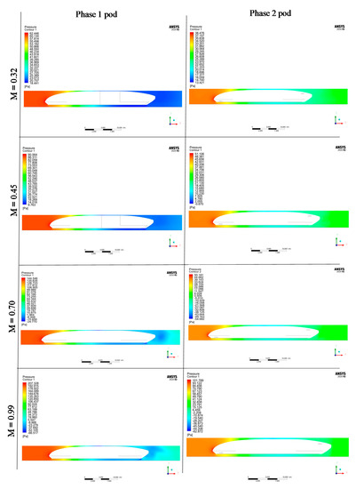 The pressure contours for Phase-1 and Phase-2 models showed that the largest pressure was experienced at the front of the pod where the air made first contact with it (Figure 12). In the Phase-1 model, the pressure was high even at M = 0.32, but this did not create any hindrance to the flow of air. At Mach 0.45 (i.e., the Kantrowitz Limit), the pressure started to build considerably at the largest cross-section, hindering the air flow, and at M = 0.7 and 0.9, a negative pressure was generated, thereby acting as a wall for the air flow to the back of the pod. This demonstrated the presence of the plunger effect when the Hyperloop pod traveled at a very high speed. With the aerofoils in the phase-2 model, the plunger effect was still present, but the pressure buildup in the front of the pod was observed to be significantly smaller.
