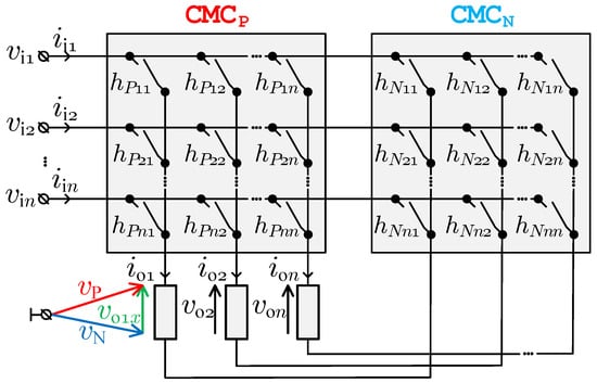 The DSM-CMC converter consists of two square-type matrix converters, and , connected to load terminals as shown in Figure 1, where the simplified diagram of the circuit is depicted. If the number of load phases is equal to n, the total number of bidirectional power electronic switches is equal to . Both converter are connected with the n-phase AC voltage source , ,…, and . The voltage of the phase of the load
