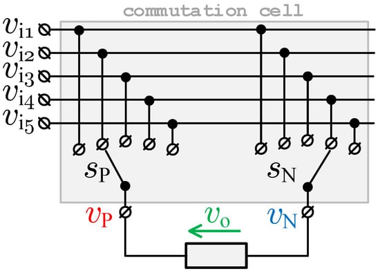 As can be seen in Figure 2, switches on both sides of one phase of the load make the single commutation cell with two voltage multiplexers, and , respectively.