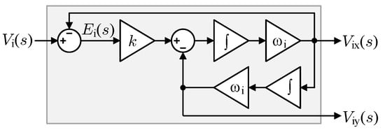 Double Second-Order Generalized Integrator with loop feedback extension functioned as Orthogonal Signal Generator (DSOGI-OSG) structure in continuous time-domain [,,]: —the input sinusoidal signal, —in-phase component of the input signal, —the quadrature component of the input signal, the error signal, k—the gain block, —reference pulsation of the input signal, and ∫ is an integrator block.