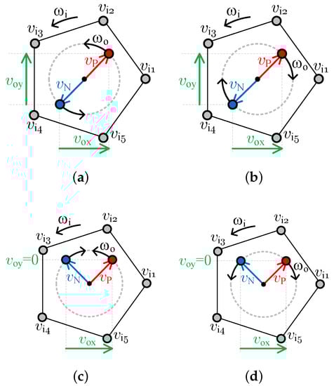 The load voltage produced by the single commutation cell, shown in Figure 2, can be analogous represented by two rotating vectors, and , as is depicted in Figure 5. Only the geometrical distance of real (indicated by subscript ) coordinates of these vectors produce the load voltage. While the imaginary coordinate (indicated by subscript ) can generate the reactive power flow at the converter input. In general, there exists some degree of freedom for selecting the instantaneous value of this component because it does not influence on the load currents. The article is focused on the cases, which locus of each output vector is straight a circle. This means that a rotating output voltage vector moves along a circular trajectory and this movement can be clockwise or counterclockwise. Four variants of the PWM modulation scheme are shown in Figure 5.