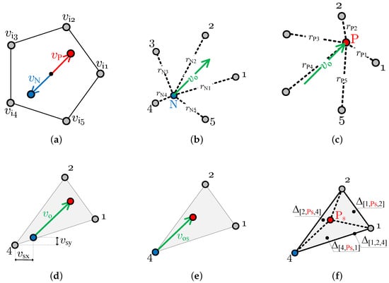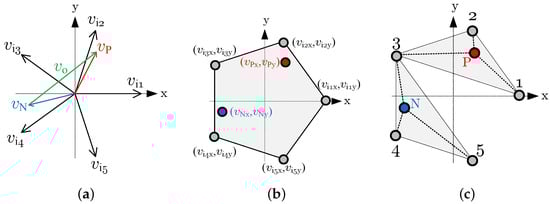 Distances between N-point and all the synthesis field vertices are calculated in Step 2. The same procedure is applied for the point P in Step 3. Next, the shortest calculated distance in a N-collection is compared with the shortest calculated distance in a P-collection . Finally, the less value is selected, which correctly indicates the optimal vertex of the synthesis field. The shift coordinates are calculated in Step 4. As can be seen in Figure 14d, vertex number 4 has been chosen. Thus, the PWM duty cycles, for the case illustrated in Figure 14f can be calculated using the following formulas.