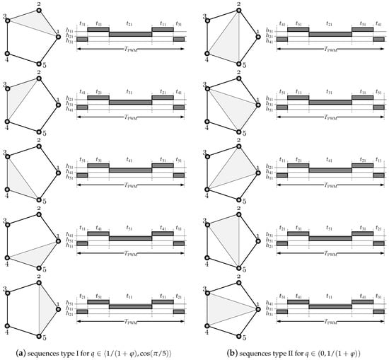 In the case of the basic solution, the sequences of the switch states always depend on the selected triangle in which the synthesis of the output voltage is realized. Therefore, these sequences can be placed in a lookup table. An overview of the basic sequences is shown in Figure 8, where the value of , which is so-called the golden ratio exists in the pentagon.