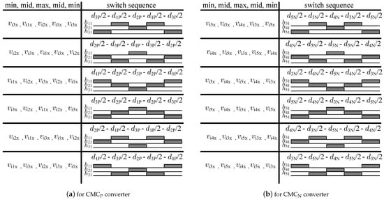 The MMM method is used to improve the quality of the voltage generated by the converter in terms of THD. The switch states sequences for the and converters are characterized in Figure 9. Note that these sequences correspond to the case illustrated in Figure 6b.