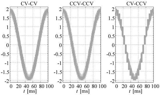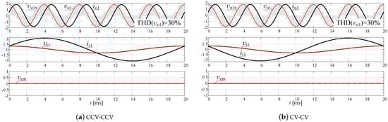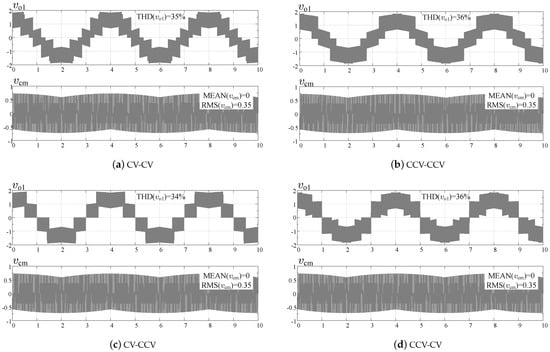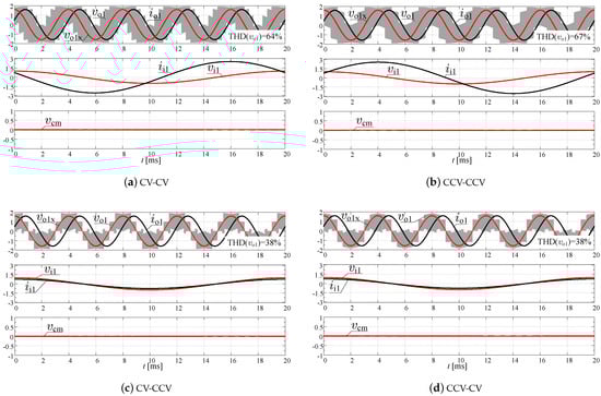 The possibility to change the rotation of the given output vector by changing the sign of the imaginary component allows realizing the PWM modulation, in which the resultant imaginary component of the takes the zero value. If vectors and rotate in opposite directions, as is typical for last two presented schemes of modulation CV-CCV and CCV-CV, the passive input current component is not generated. Simulation results of the PWM variant 1 for DSM-CMC 5 × 5 and four modulation schemes are shown in Figure 10. Simulation parameters are listed in Table A1, which can be found in an appendix.