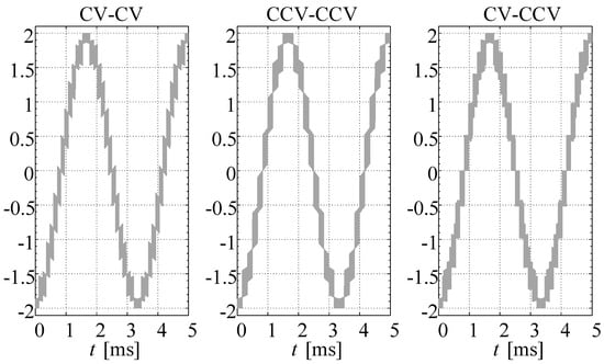 Having half the number of switching operations during the PWM modulation period is an advantage of variant 3. In order to obtain the unity power factor at the system input, the sequence types have to be toggled continuously in the order CV-CV, CCV-CCV,…, etc. However, this mode of operation may require to redesign of an input filter. Example simulation results of the PWM variant 3 with toggling mode for DSM-CMC 5 × 5 have been presented in Figure 18.
