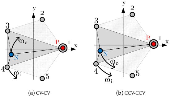 A vector arrangement in Figure 6a, for the given commutation cell, can be presented as the rotating polygon as illustrated in Figure 6b. The polygon surface is named here as the output voltage synthesis field. All the points, which represent output voltage vectors, have to be located inside the synthesis field. Such a geometric arrangement allows for direct application the Wachspress function for the PWM duty cycles calculation [,]. However, the number of switching within the modulation period should be minimal, and for this reason, Venturini and Wachpress solution is not suitable. Decreasing the number of switching can be realized by applying the Nearest Three Vectors (NTV) modulation technique, which relays on the selection of a proper triangle in the synthesis field. Figure 6c shows two selected triangles for the voltages generated by and converters. Note that both points, representing these voltages, are located in their triangular local synthesis fields. This is the required condition of output voltage synthesizability. The selection of the optimal triangle may consist in finding the appropriate vertex of the synthesis field, which clearly indicates the input vector closest to the output vector. In the case of using NTV technique, this solution is sufficient, because the other two required vectors are adjacent to the selected one. As can be seen, vector is closest to the vertex number 2, while vector is closest to vertex 4. All six required PWM duty cycles can be calculated using the smooth interpolation technique, which is, in the discussed case, nothing more than an appropriate triangle area relation for the NTV modulation []. An area of the triangle can be computed using the second-order matrix determinant. Thus, an application of that solution only needs coordinates of the triangle vertices. As mentioned earlier, these coordinates can be computed using the DSOGI-OSG block shown in Figure 4.