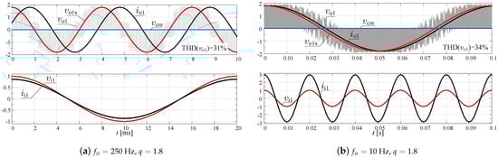 Properties of this type of matrix converter, compared with counterpart 5 × 5, remains the same. In particular, the common-mode voltage is also eliminated by using the basic type of switches state sequences. The voltages shown in these figures are characterized by a low THD, which is about 12%. Comparing to the 5 × 5 topology, the resulted voltage gain for DSM-CMC is higher and takes optimally the value of .