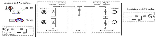 Focusing on the power oscillation problem of the sending network, domestic and foreign scholars have investigated the following aspects using the eigenvalue method, complex torque coefficient approach, impedance analysis approach, etc: (1) the problem of SSO in SGs via HVDC transmission [9,10,11]; (2) the SSO of wind turbines transmitted via HVDC [12,13,14,15]; (3) the SSO of wind–thermal bundled systems transmitted via HVDC [16,17,18].