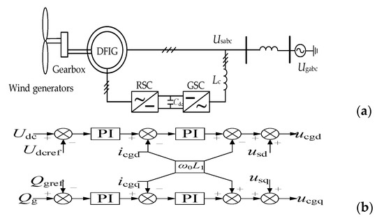 The topology and control system of a DFIG: (a) topology structure; (b) control strategy of the grid-side converter (GSC); (c) control strategy of the rotor-side converter (RSC).