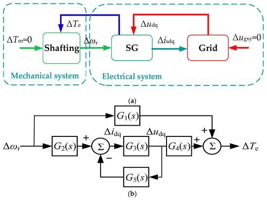 Equations (7)–(10) reflect the formation mechanism of SG electromagnetic torque, thus giving the formation mechanism diagram shown in Figure 3a. The SG speed disturbance is the input signal, and the electromagnetic torque is composed of two branches, of which the first branch is mainly determined by the SG electrical part and the second branch is codetermined by the SG electrical part and the grid. The expressions of G1(s), G2(s), G3(s), G4(s), and G5(s) in Figure 3b are shown in Equation (A1) (Appendix A).