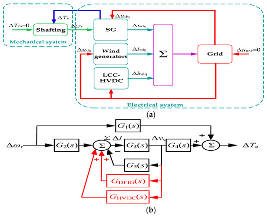 When the DFIG and HVDC are connected to the system, the mechanism of interaction with the SG is shown in Figure 4. It can be seen that the rotor disturbance Δωr of the SG is the input disturbance of the electrical system. The output current disturbance Δisdq is formed through the electromagnetic coupling relationship of the electrical part. On the one hand, Δisdq directly forms the electromagnetic torque disturbance ΔTe and acts on the rotor; on the other hand, the terminal voltage disturbance Δudq of the SG, wind turbines, and HVDC is formed by the grid coupling. The SG terminal voltage disturbance through its electromagnetic coupling relationship intensifies ΔTe and Δisdq; then, Δisdq interacts with the terminal voltage disturbances of wind turbines and HVDC to produce current disturbances Δirdq and Δihdq. Furthermore, Δirdq and Δihdq are superimposed to continue the grid function and form a new terminal voltage disturbance Δudq, which further aggravates ΔTe until the system rebalances or loses stability.
