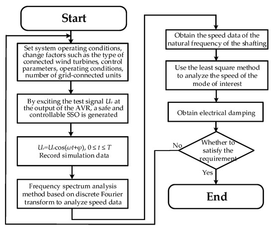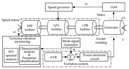 The basic principle of the additional excitation signal injection method is shown in Figure 5 [25], which shows that the modal signal generator superimposes the excitation test signal us with controllable angular velocity, amplitude, and duration to the output of automatic voltage regulator (AVR). The us can generate the electromagnetic torque disturbance ΔTe, and it excites a safe and controllable SSO in shafting system. After removing us, the change in generator speed depends on the result of the interaction between the mechanical damping and electrical damping of the system, and the damping can be identified using the spectrum analysis method on the basis of discrete Fourier transform. Since the influence of mechanical damping is not considered in this paper, the mechanical damping was set as 0. The main process of the injection method is depicted in Figure 6.