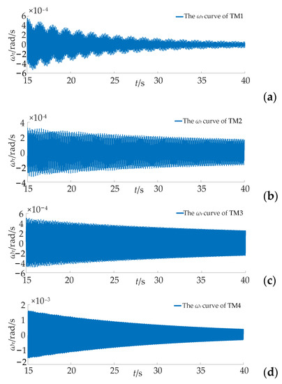 The rotor speed curve of SG torsional mode after repealing the disturbance: (a) TM1; (b) TM2; (c) TM3; (d) TM4.